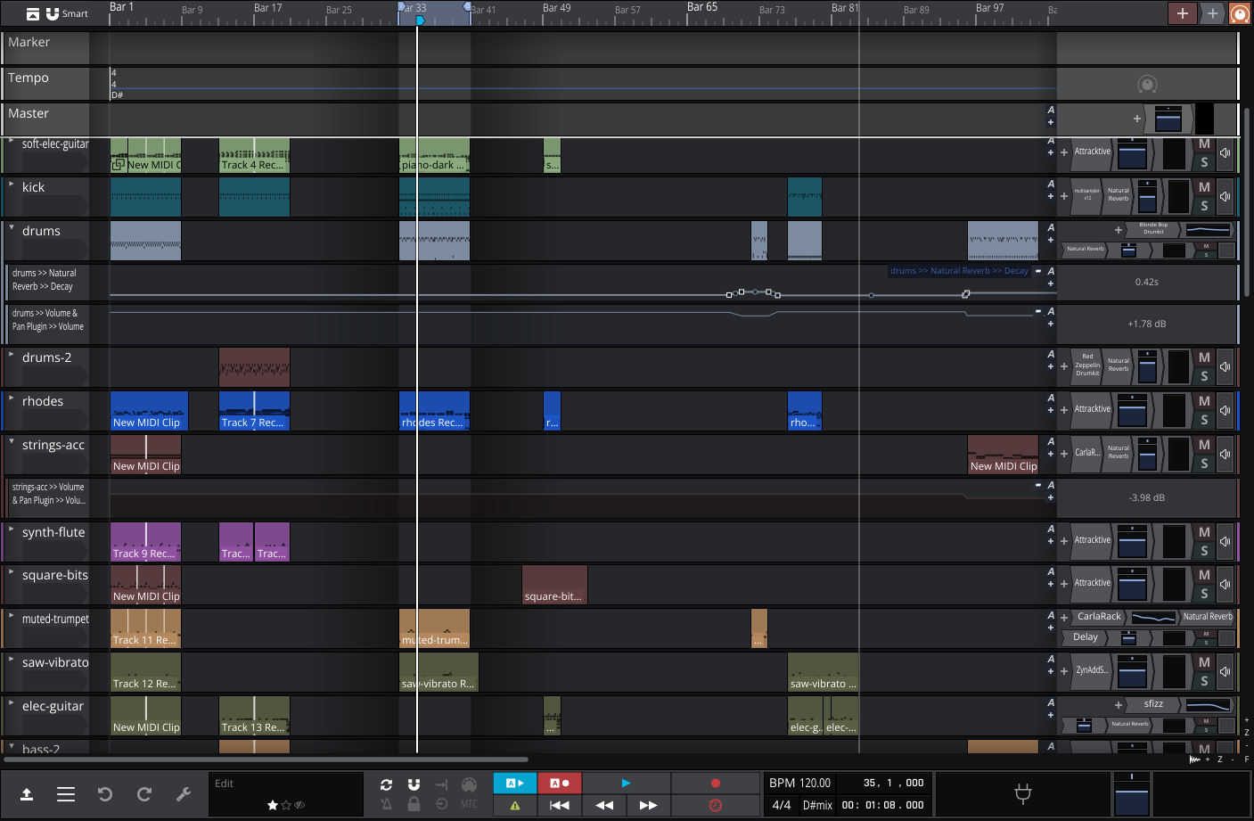One of its strength is that it allows to use many plugins, as long as they are compatible with the OS. And it's here that I faced some troubles. DAW plugins are weird. They are often opinionated in their UX, and each one comes with their restrictions and bugs. One of the plugin would sometime completely erase the configuration I carefully crafted for the instrument (making me paranoid and saving as frequently as I could). One would sometime stop working and requires to reload the preset. And some of them even repeatedly made Waveform crash! Was it because of the size of the project? I did not remember them being so capricious elsewhere. And by the time their crashing became really obnoxious, it was too late to find a replacement. The only solution was to disable them and silence their track… Until I wanted to write a new part with them, that is!